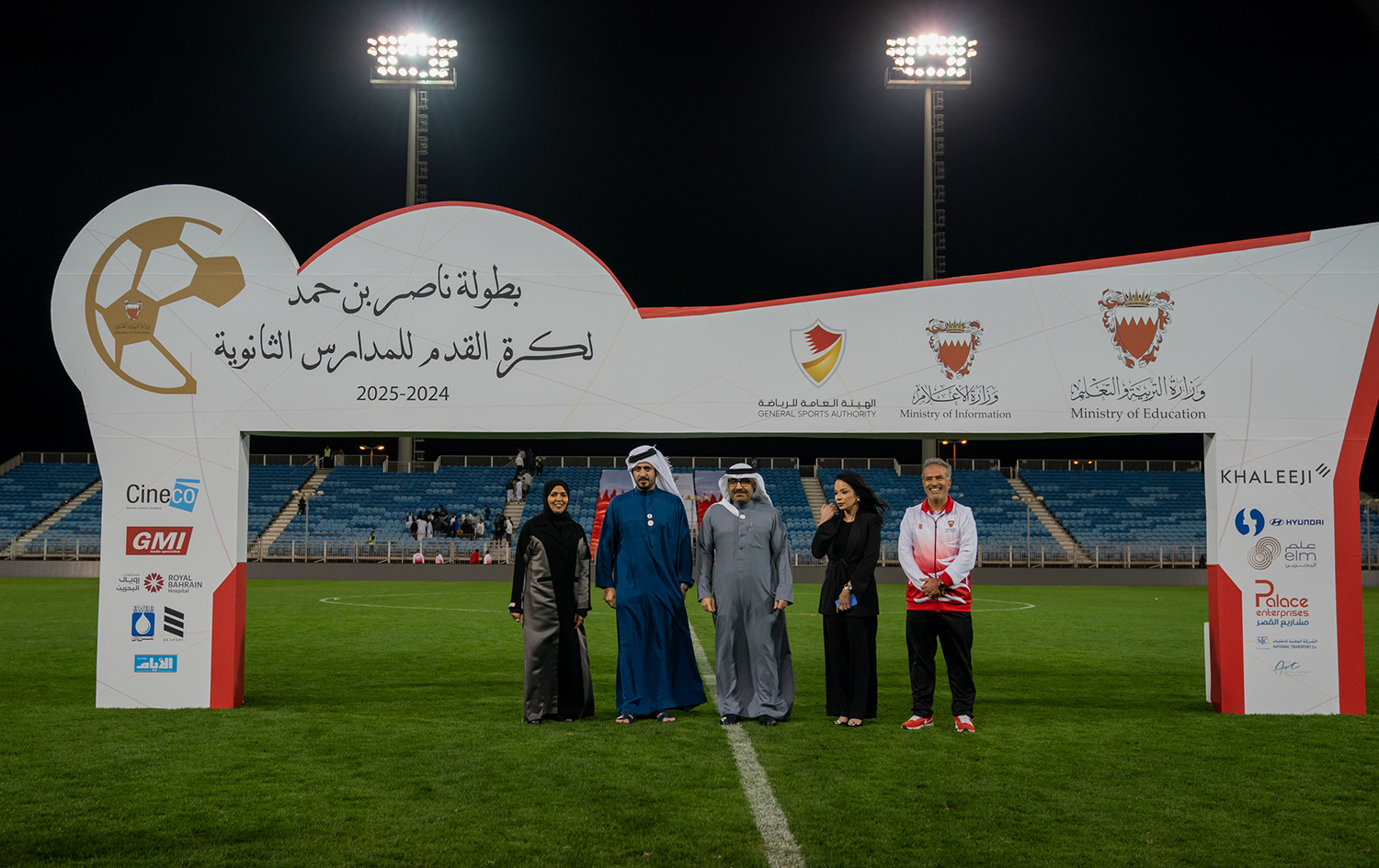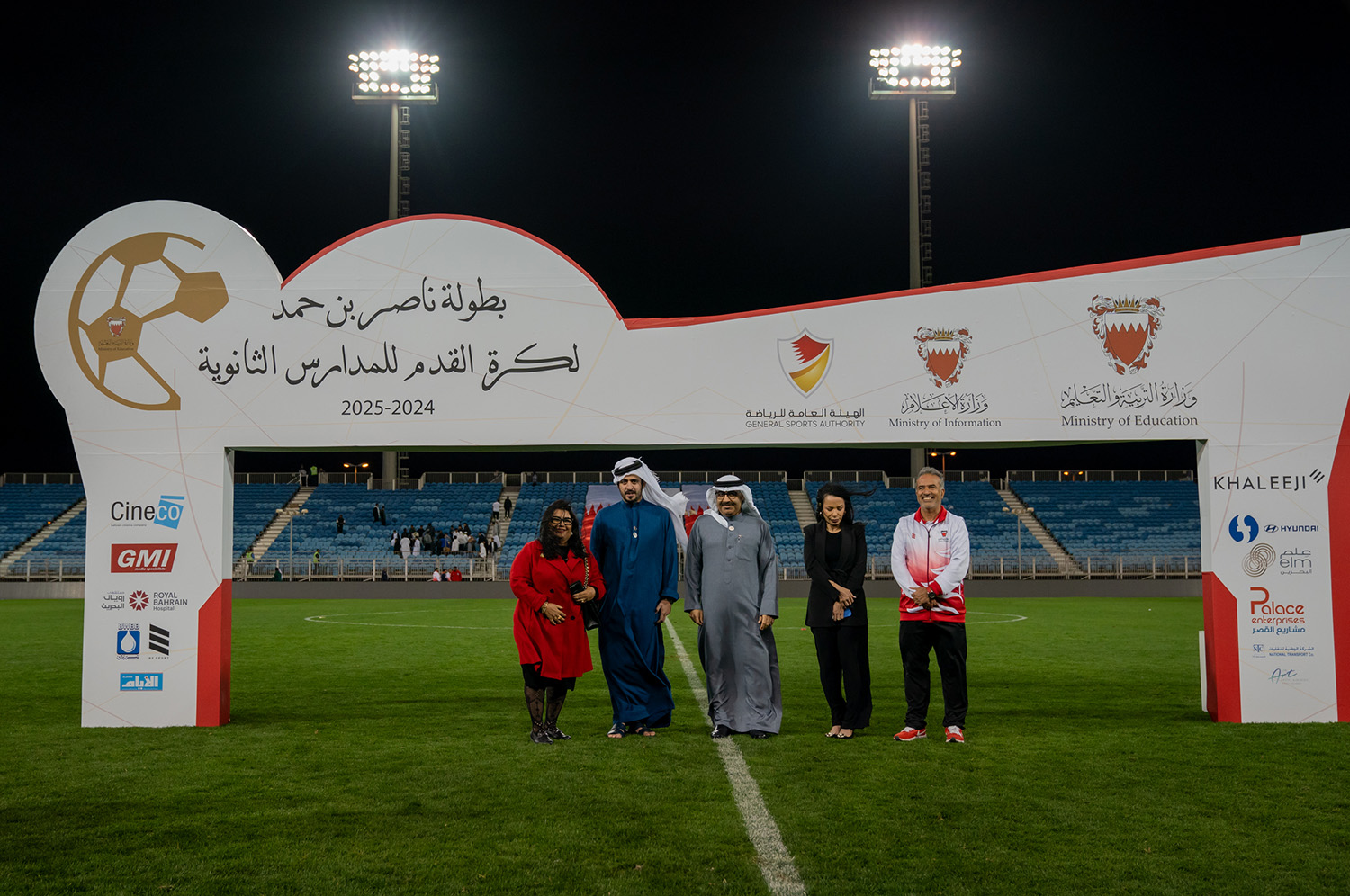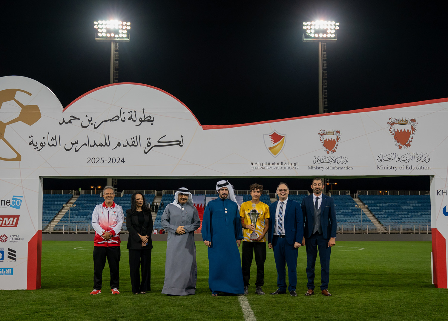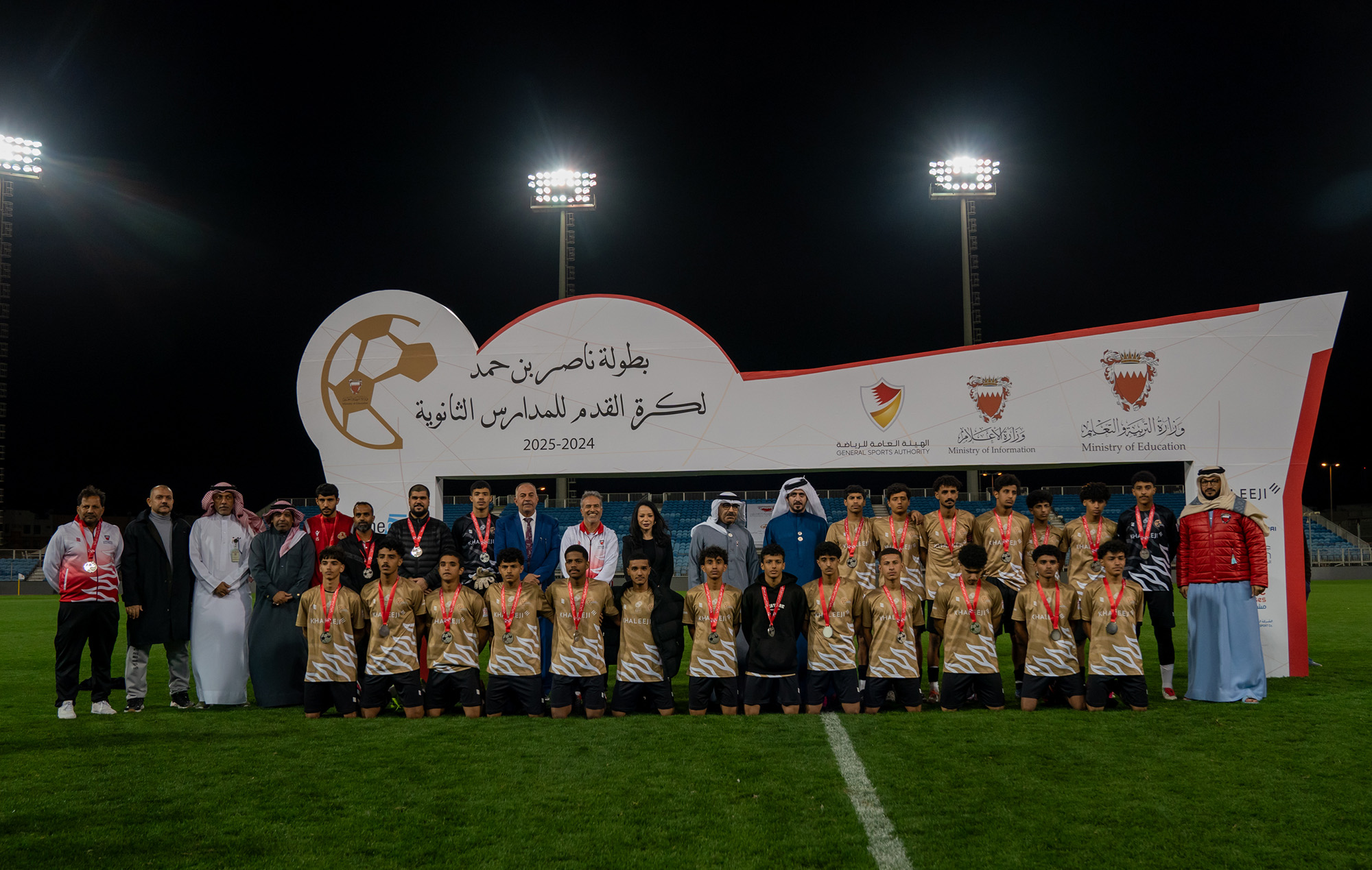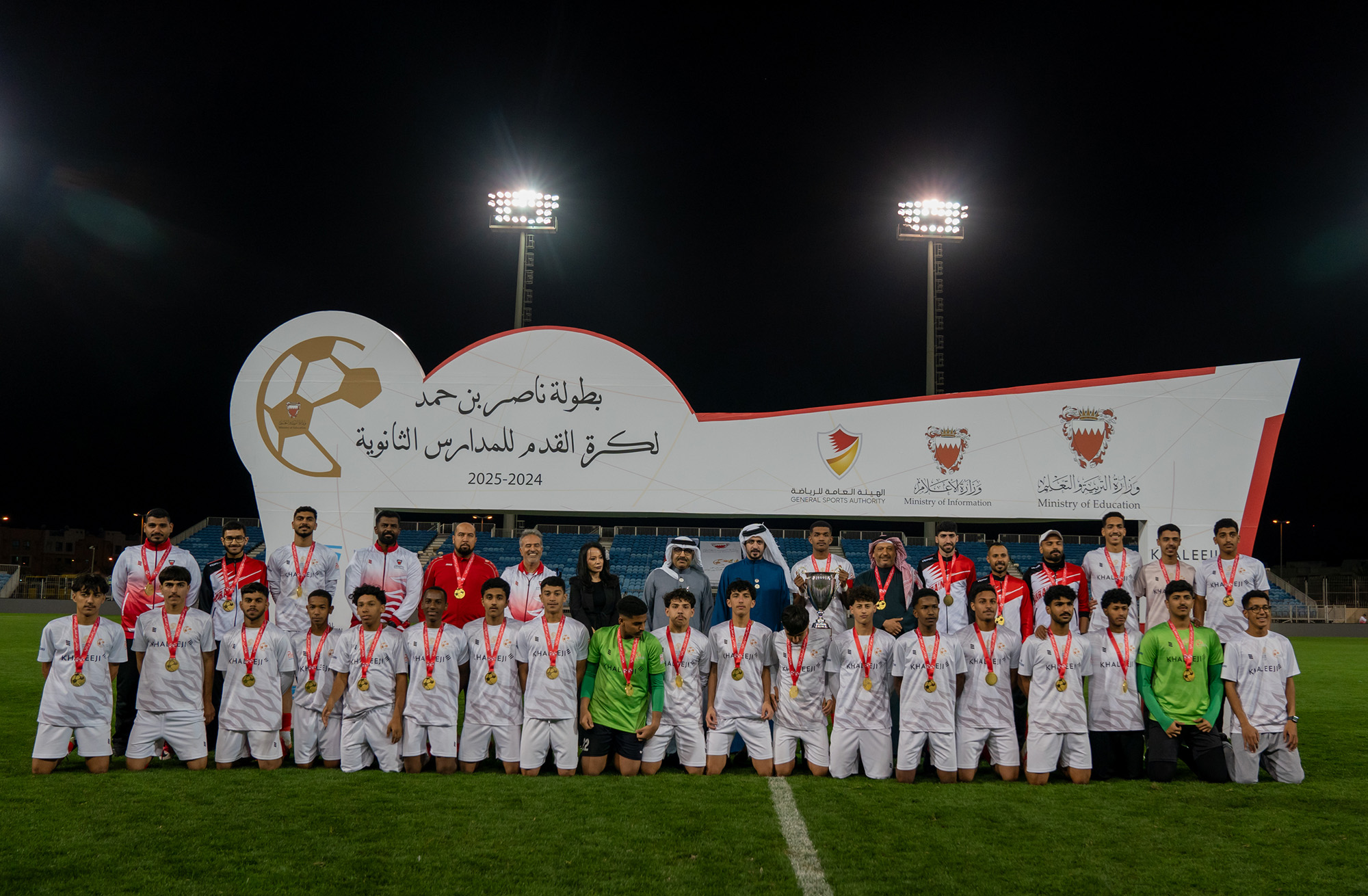 برعاية كريمة من سمو الشيخ ناصر بن حمد آل خليفة ممثل جلالة الملك للأعمال الإنسانية وشؤون الشباب رئيس المجلس الأعلى للشباب والرياضة، وبحضور سمو الشيخ خالد بن حمد آل خليفة النائب الأول لرئيس المجلس الأعلى للشباب والرياضة رئيس الهيئة العامة للرياضة رئيس اللجنة الأولمبية البحرينية، أقامت وزارة التربية والتعليم المباراة النهائية لبطولة ناصر بن حمد لكرة القدم للمدارس الثانوية للعام الدراسي 2024-2025م.